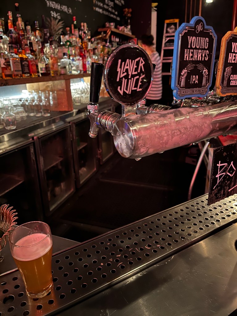 Whoa. We are staying in Circular Quay. So last night we walked over, at the end of a nearly perfect warm summer day. Mary’s is across from a little park, next to a coffee house, and has an outside beer garden under tents, which was hopping and fully packed at 6:45 on a Thursday night. The friendly waiter found us some high-top seats inside instead. Turns out that was the right call. The bar is dark, all the lights are red, and the music is a heavy and just not-loud enough to talk over. To my middle-aged eyes, it pulsed with cool. Happily, Slayer Juice (a black IPA) is still on tap (“We had to replace it for a while, but this is the O.G S.J.”)
