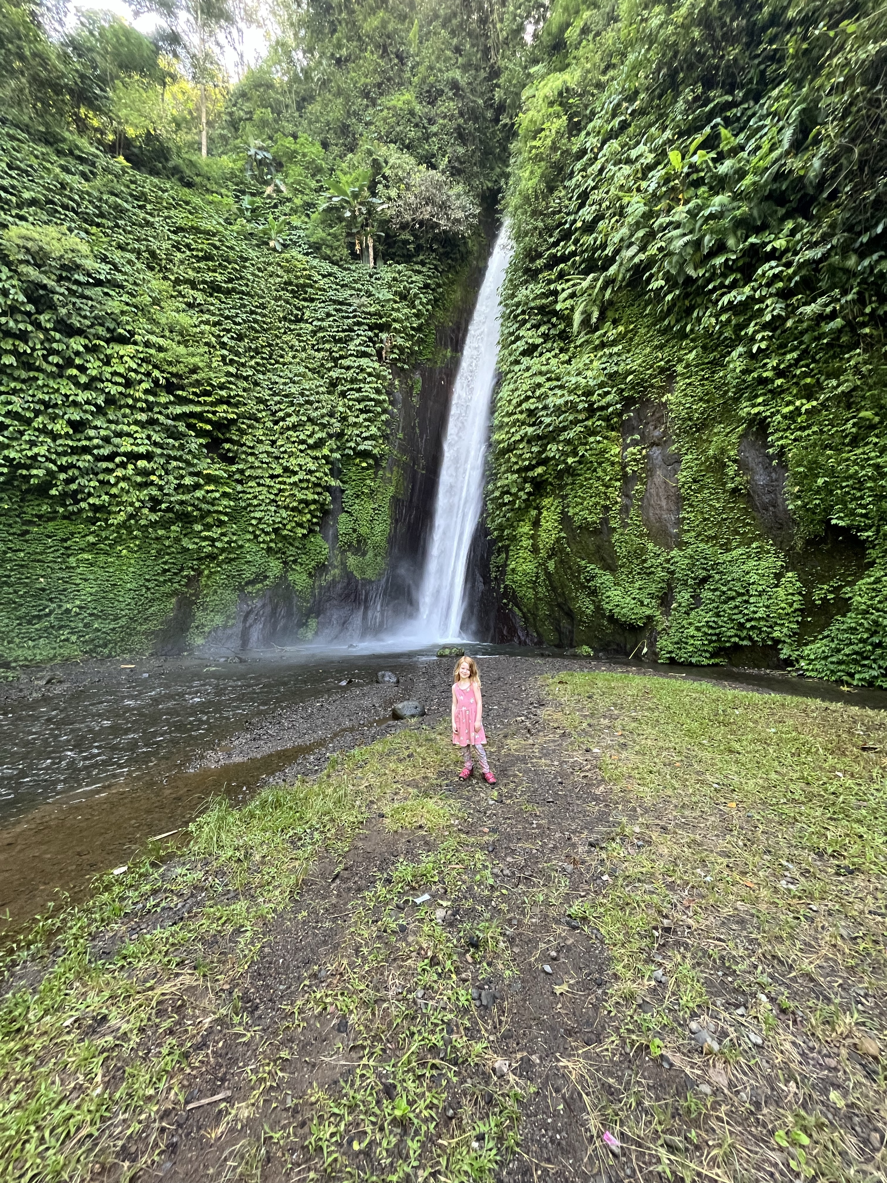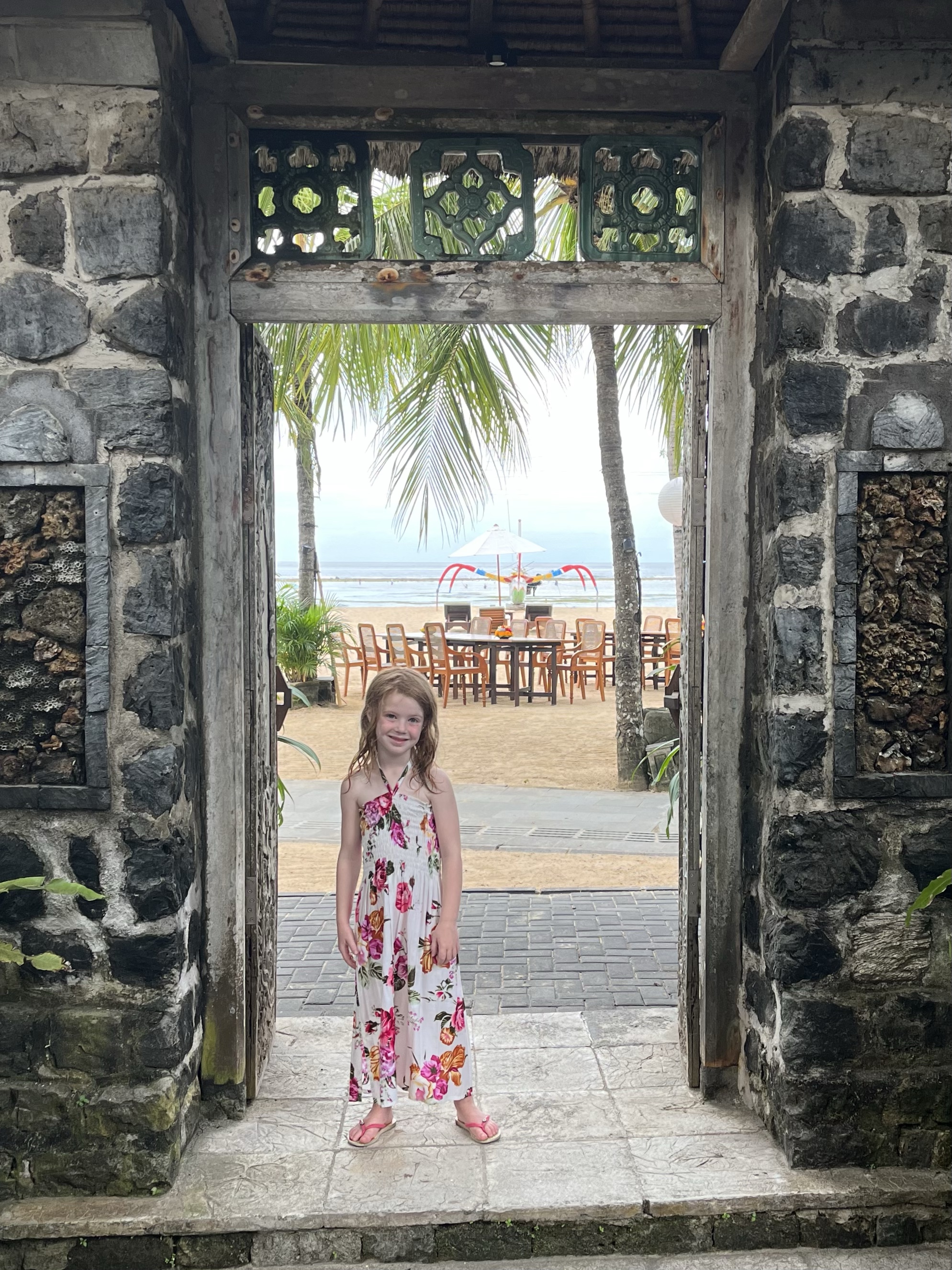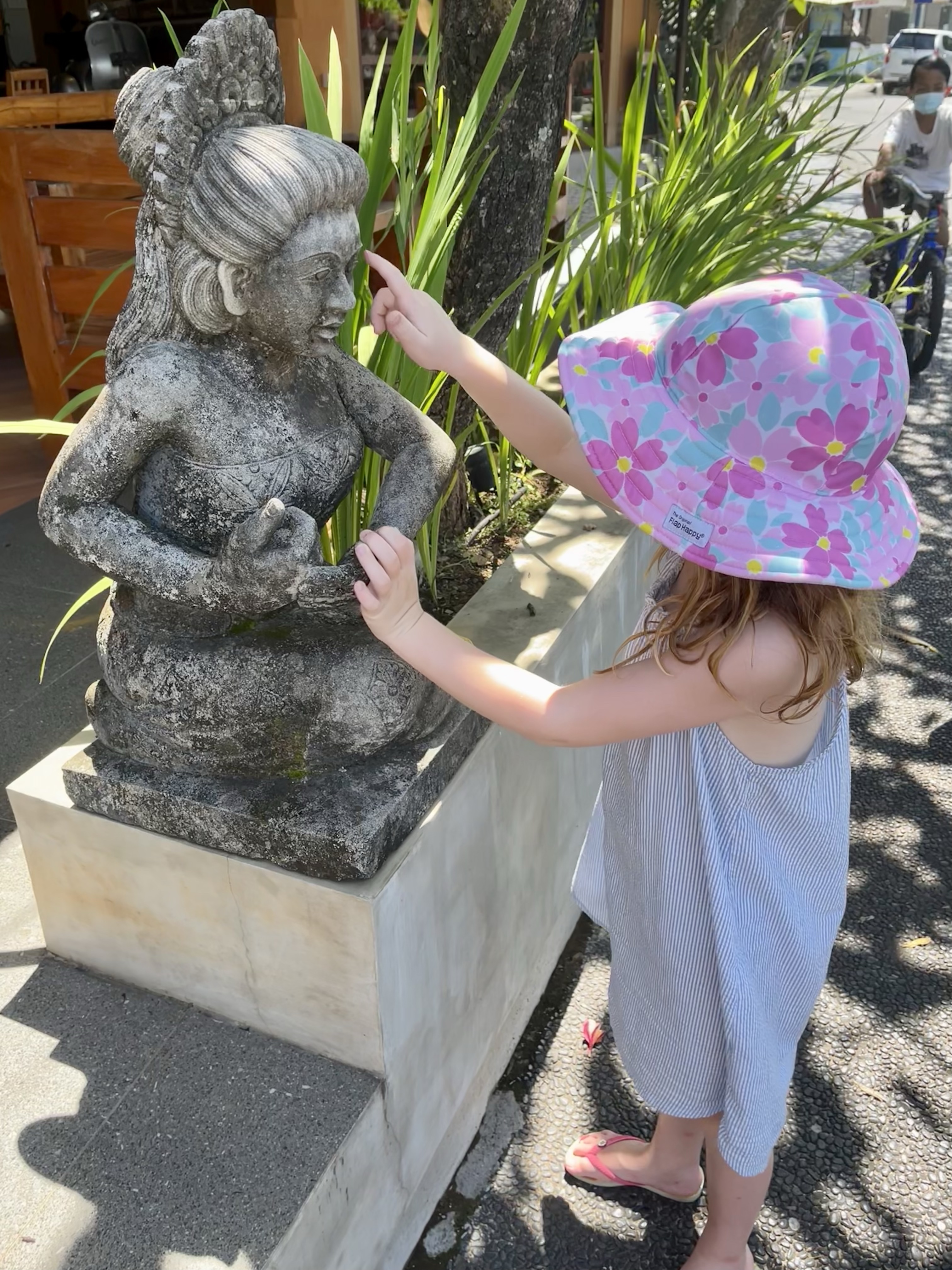 Bali is part of the country of Indonesia, but has a culture all its own, including its own language (Balinese) and religion—while most people in Indonesia are Muslim, most people in Bali practice Hinduism. Fiona loved the bright and beautiful temples we saw and the fresh, flower-filled offerings we found in those temples, as well as on sidewalks, atop statues and pretty much everywhere else.