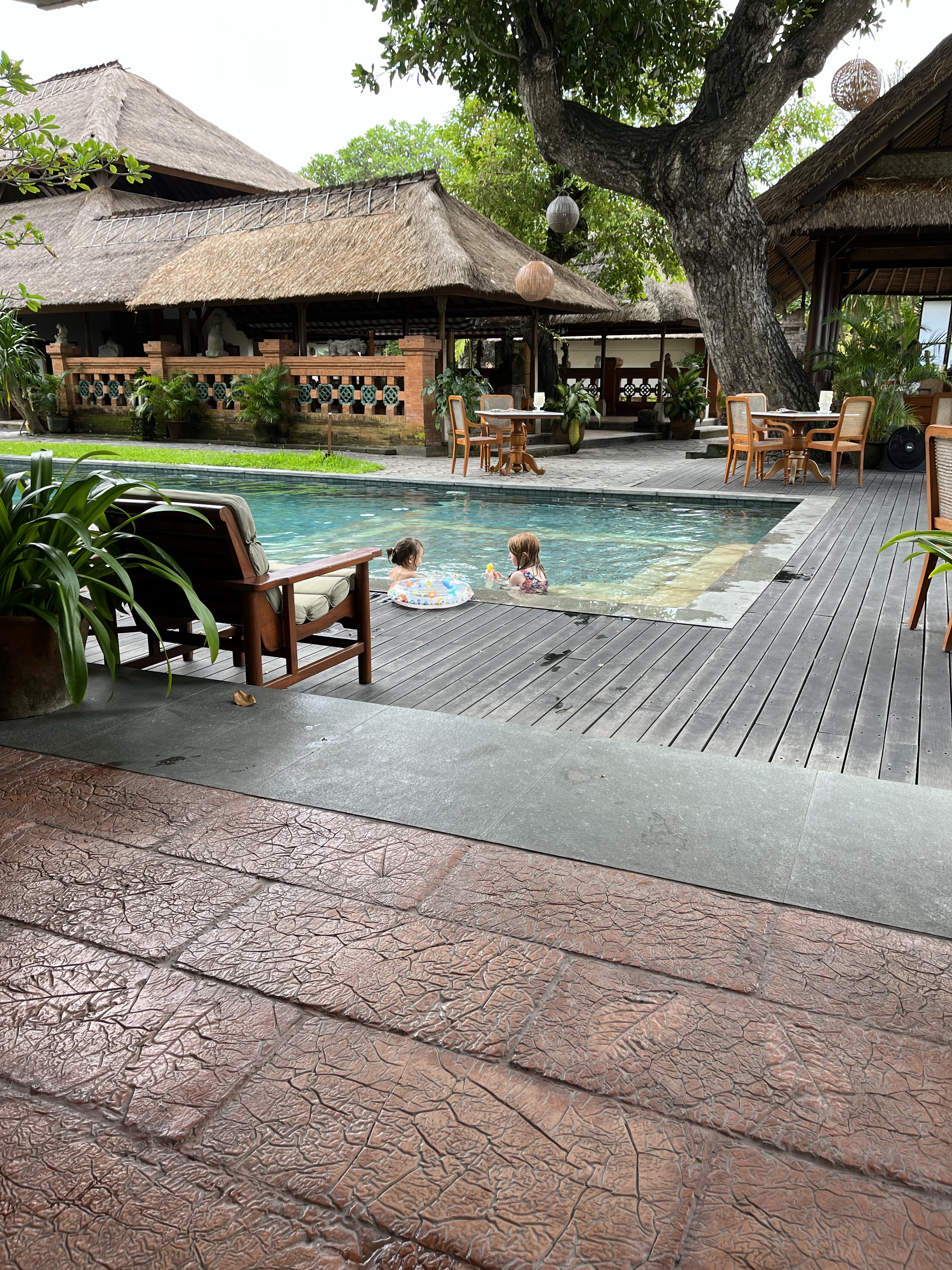 Tandjung Sari is an outside hotel, and we have our own little room. There are lots of statues, and a pool, and it’s my favorite pool ever!