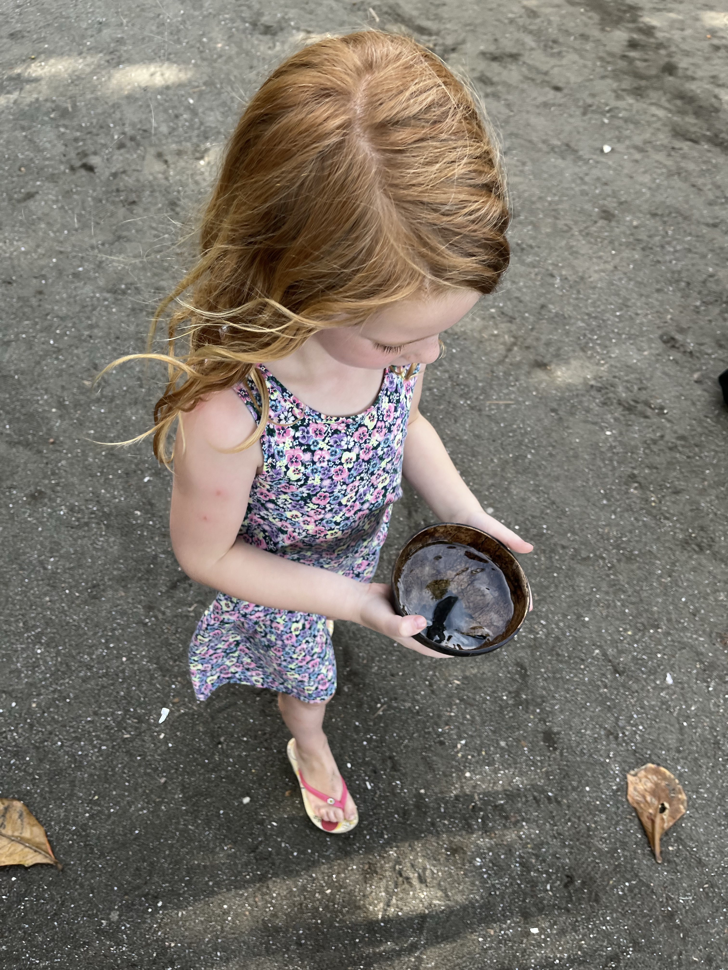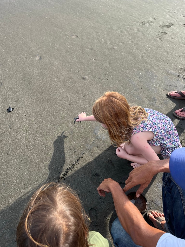 At the turtle conservation [center] I got to see some baby turtles and the baby turtles grow up to be about that big [arms spread super wide apart]. They were like this tiny [fingers close together], but they grow up to be that big. And then, also, one of the baby turtles that grow up to be that big, I got to put it in a bowl and put it on the beach and it got to use its arms and squiggle out to sea. [At sea,] it’s going to swim and it’s going to have birthdays. It will have 25 birthdays before it comes back. When it comes back it’s gonna lay its own eggs on the exact same beach. I named my turtle Lily.
