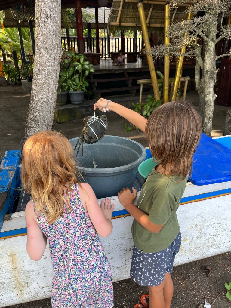 I went to the turtle conservation [center] with Clive, a boy I met in Bali [the 7-year-old son of the owners of our hotel]. You could touch the turtles’ shells but not their heads. I also got to see some fish and crabs all tied up [that some local fisherman had caught].
