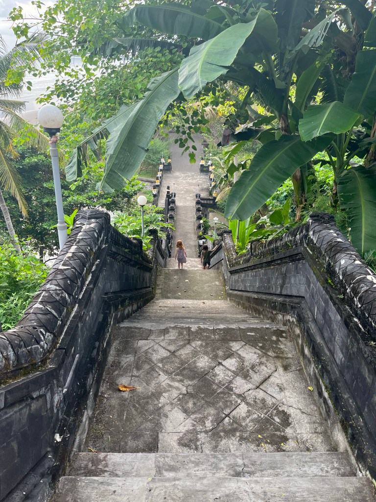 On our hiking day in Munduk we saw the same waterfalls as before, but two of the three ticket booths where you pay a few dollars park fee were deserted. The stairway to the falls was mostly overgrown, and the bridge across the river below the falls was gone, taking away the easy way back to town. We had to walk back up 350 stairs to get back. Fiona was a champ, but it was eerie. If nobody’s hiking, nobody’s maintaining.