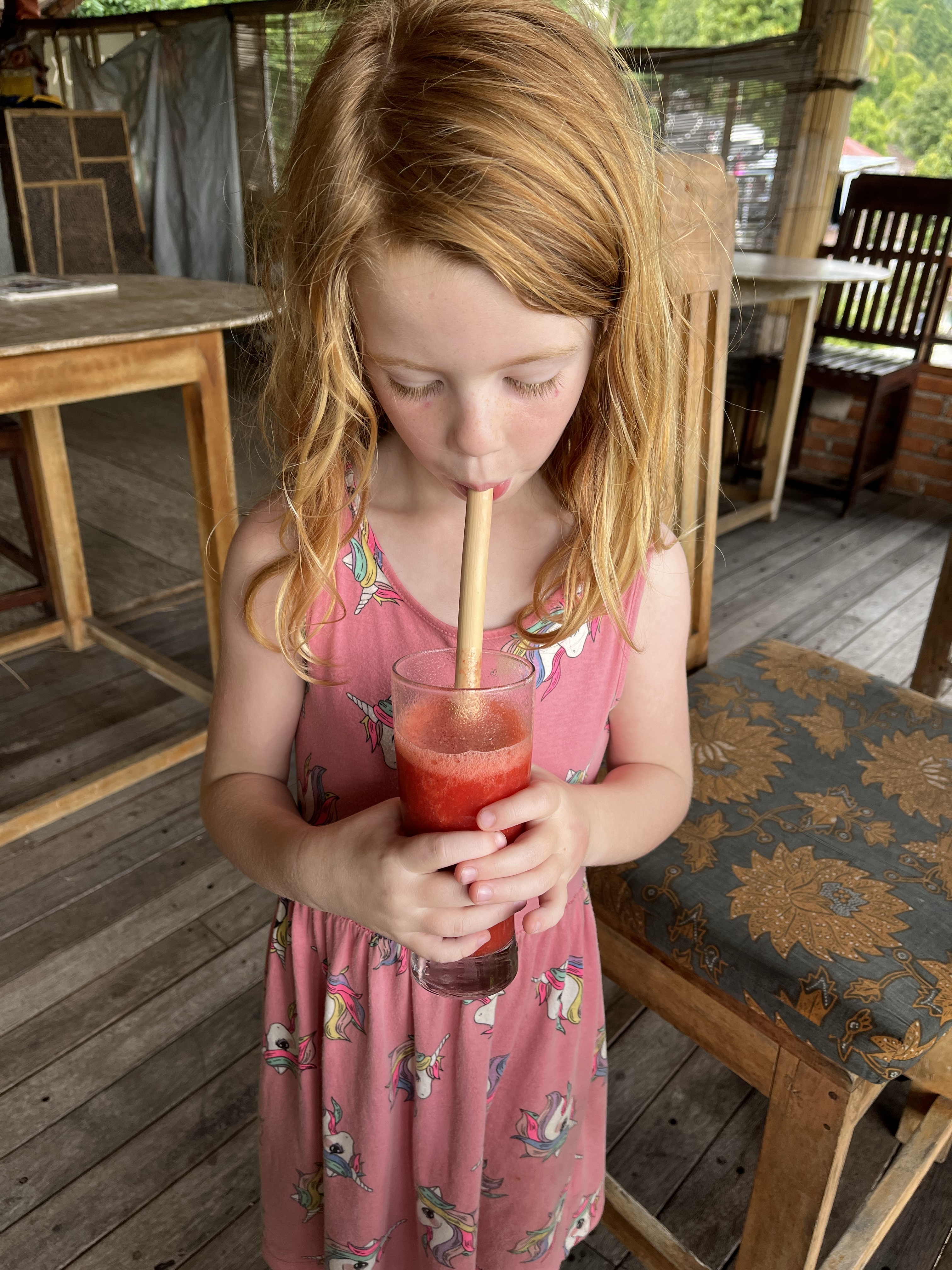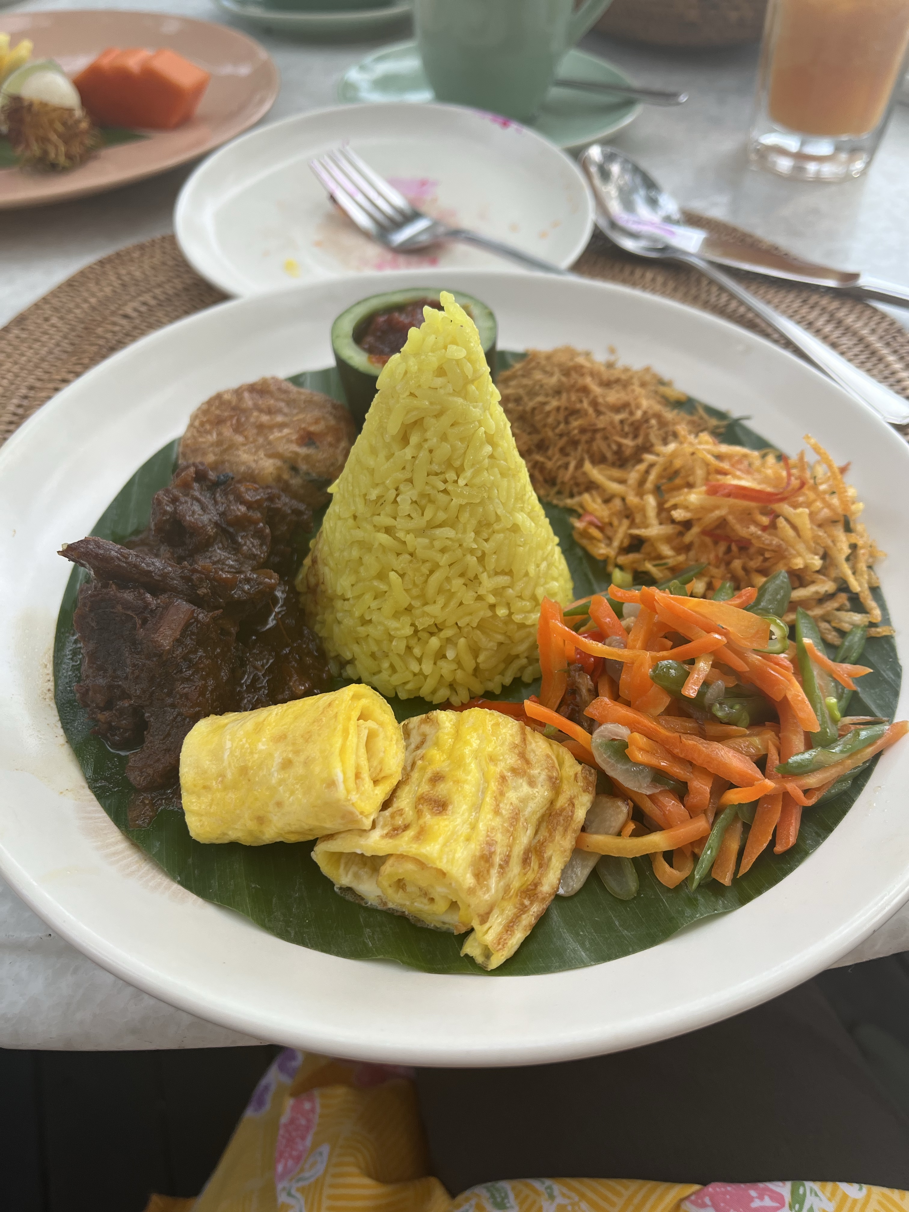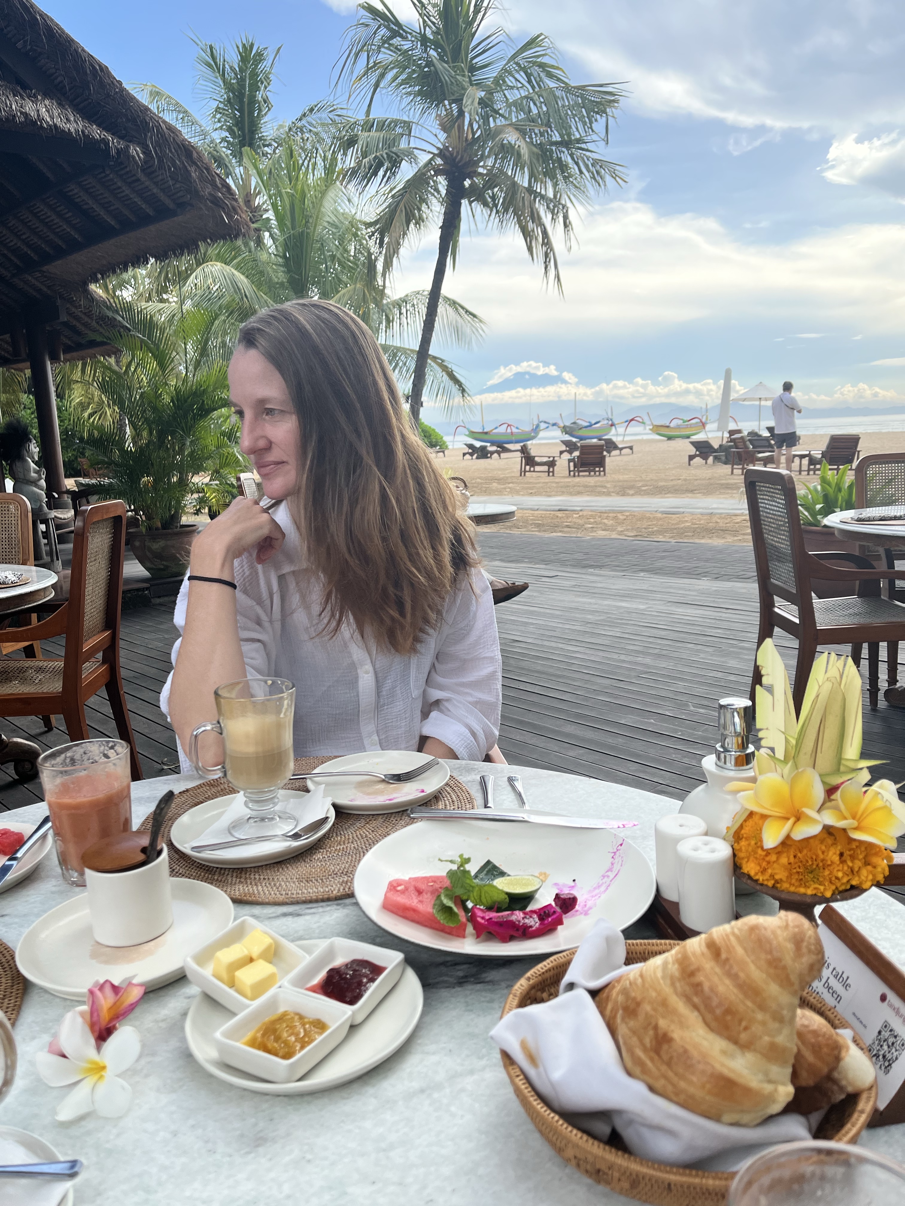 - Breakfast: Breakfast is almost always included with your hotel stay and we got our money’s worth every darn morning. Bali coffee (darker and siltier than we had in Australia but still yummy), papaya and pineapple and watermelon, fresh-fruit smoothies, trays of baked goods both familiar (croissants and toast) and novel (purple-hued rice dough stuffed with sweet coconut filling)—and that’s just to warm you up for whatever you actually order, usually eggs or nasi goreng (Dan), yogurt and granola (me) or pancakes (Fi). It’s enough to make you want to head back to bed for a little nap before actually starting your day.