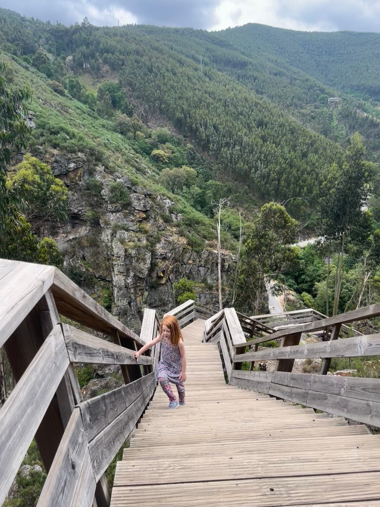 In Sande, we stayed right next to the Douro River, where Fi had fun kayaking with her dad and watching big boats sail by. She also did an amazing job climbing up and down the 500 steps (!) of the Pavia Walkways to a see a cool waterfall and a huge bridge. Fortunately, there was ice cream back at the bottom.