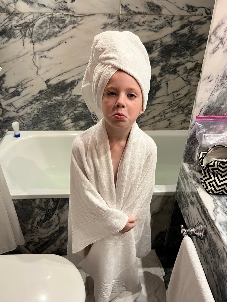 “We went to see a waterfall. It was fun, we jumped in a lake. It was NOT super warm but it was fun to swim in. We had to climb over a lot of rocks, and guess what: My parents carried me because I got a big scratch on my knee [on the first part of the hike]. It was fun except for the part when I fell.”