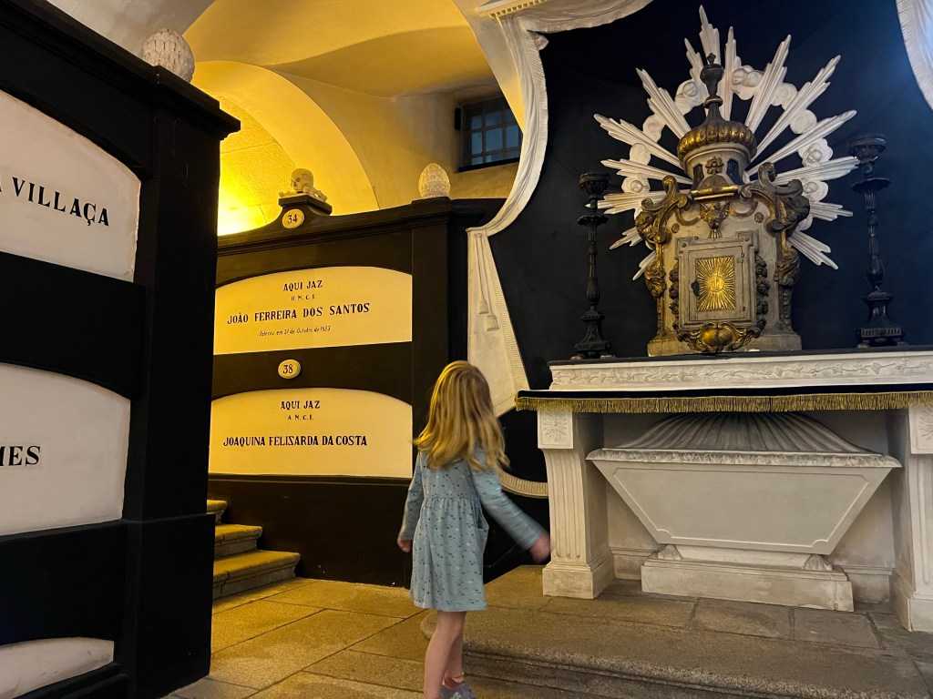 We also explored the city with Fi’s great-aunt and -uncle, who were visiting at the same time we were. Together, we rode a cable car along the river, walked across the Luis I Bridge and toured the Church of Sao Francisco. There were catacombs in the basement, complete with skull-topped headstones and a big pile of bones you could see through a window in the floor. Before we leaving town, we stopped for lunch at a sandwich shop where Fiona had what she declared was the “best. burger. EVER!!” (She ate it so fast we didn’t even get a picture!)