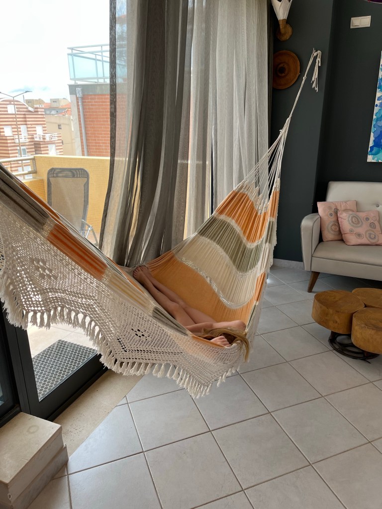 In Gafanha da Encarnacao, we stayed near the beach. Unfortunately, it was too cold to swim or play in the sand much, but the apartment we stayed in had hammocks that could hang inside or out, and Fiona had a teeny room all to herself at the top of a twisty staircase that she loved playing pretend in. On the day we left, we visited a town called Aveiro where people tie colorful ribbons onto bridges to symbolize friendship and love.
