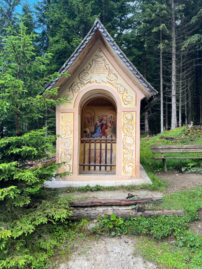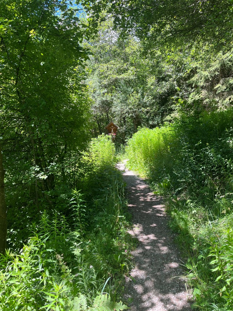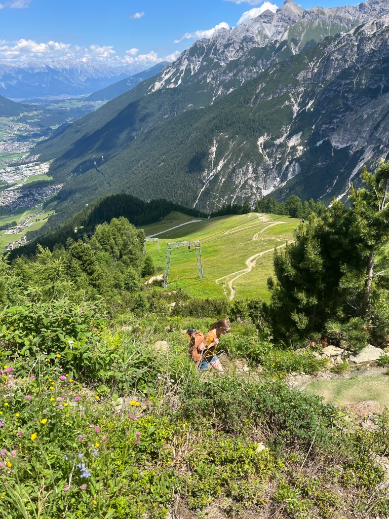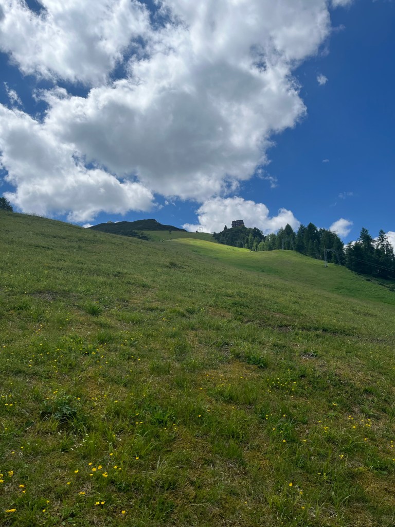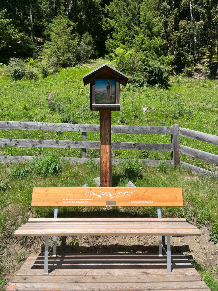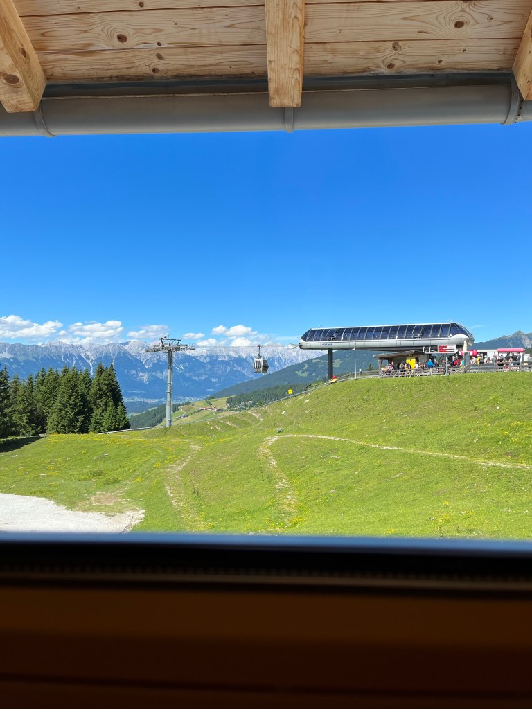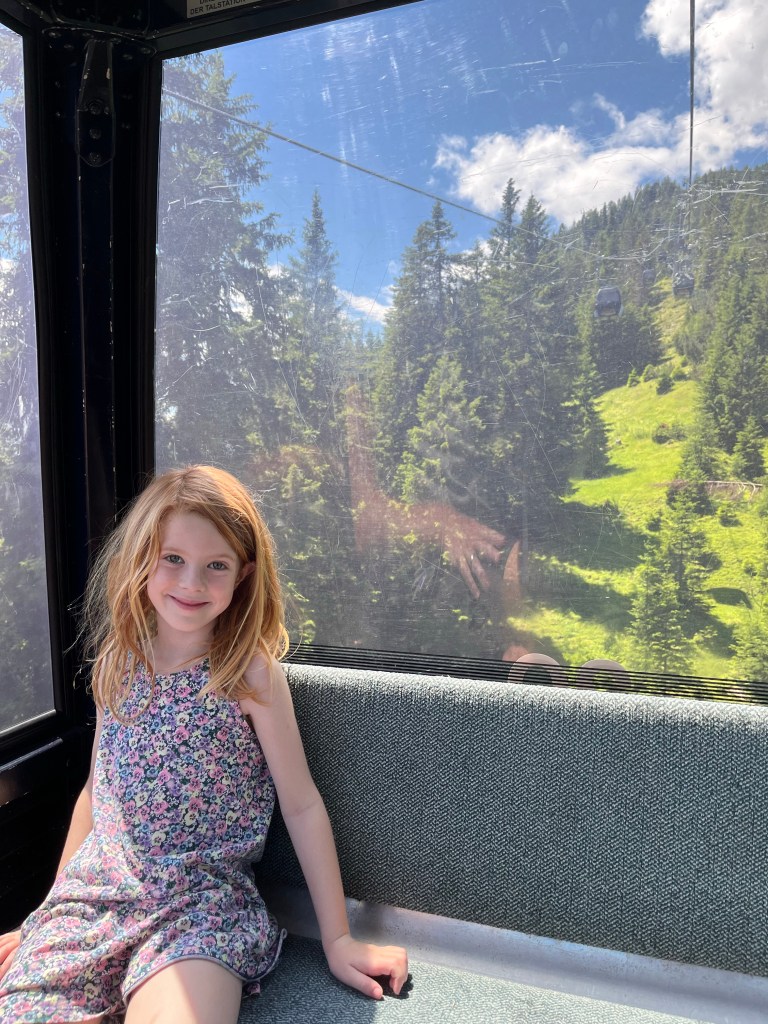 We did not have much energy on our very first day in Medraz, so we took a little walk from where we were staying at Villa Sonnegg to the Kreuzjochbahn gondola, taking in the mountains above and the little benches and shrines everywhere. It was a beautiful little walk, and as the cable car cranked up the mountain, everything opened up in front of us. Wow.