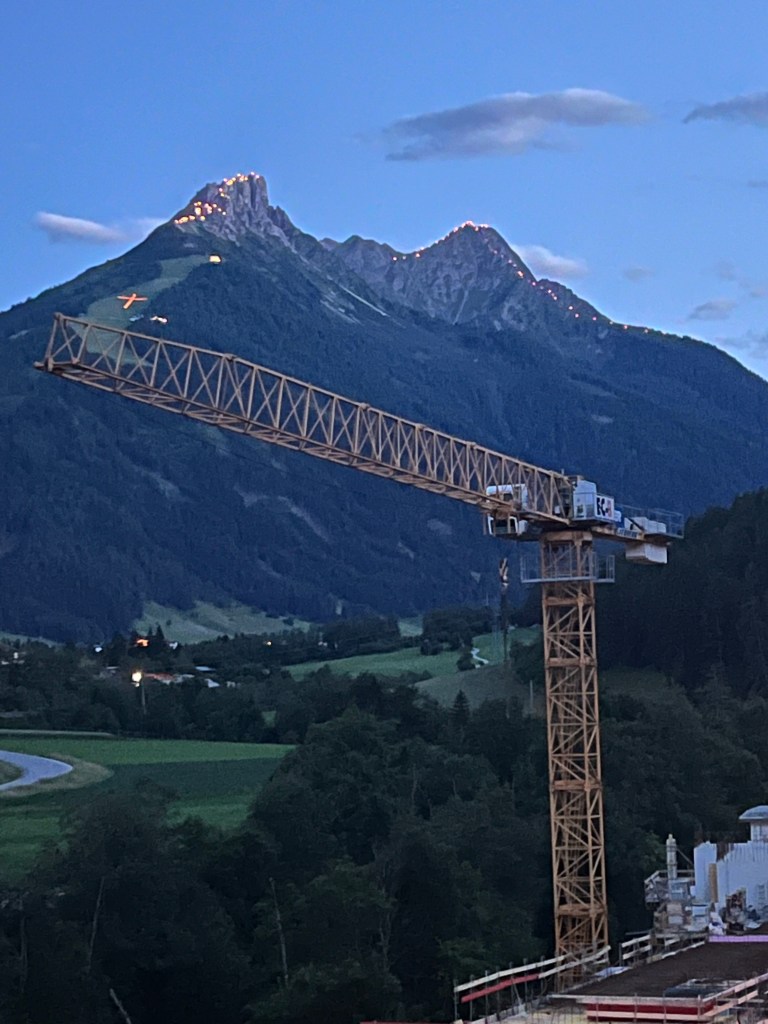Then… night happened. Every year in the Stubai, they commemorate the war against Napoleon – yep, that guy – over two hundred years ago. The commemoration is wonderful – they light fires on every mountain in the valley. Some climb up the ridges. Some are shaped like crosses or hearts. All are beautiful.