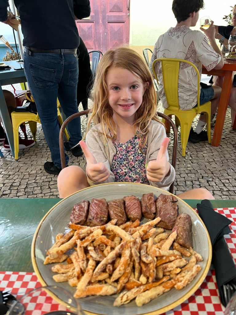 - Dinner at Ta Gente, Ponta Delgada. Fiona ordered her steak medium rare, and the hipster-ish waiter asked “are you sure? That’s the way I like it.” We all affirmed, and you can see a very happy kid below. It was a fantastic steak – one of the best of the trip. Julie and I shared a few tapas dishes – the highlight was the broken eggs with chorizo, sweet potato, and asparagus. Stunning.