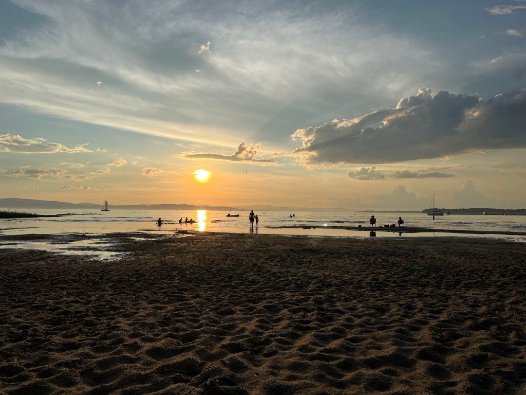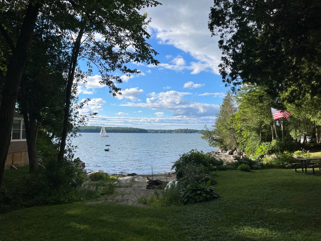 Lake Champlain is big and varied, with quiet little beaches where I remember taking toddler Conor to throw rocks and vast expanses of open water that are a blast to travel by boat. This time we had two lovely excursions to the lake, the first at my sister’s family’s “camp” (which, apparently, is the New England word for a little lakeside cabin they rent out during the summer). We happened to be there over a rare weekend when it wasn’t occupied, so we drove out to North Ferrisburgh for an evening to avail ourselves of the deck, the grill and the views. The following weekend, on another part of the lake entirely, we took some pizza and chairs to the Burlington Surf Club, a low-key beach resort where you can be very active or not very active at all (I’ll let you guess which one I decided to be) while watching a pretty killer sunset.